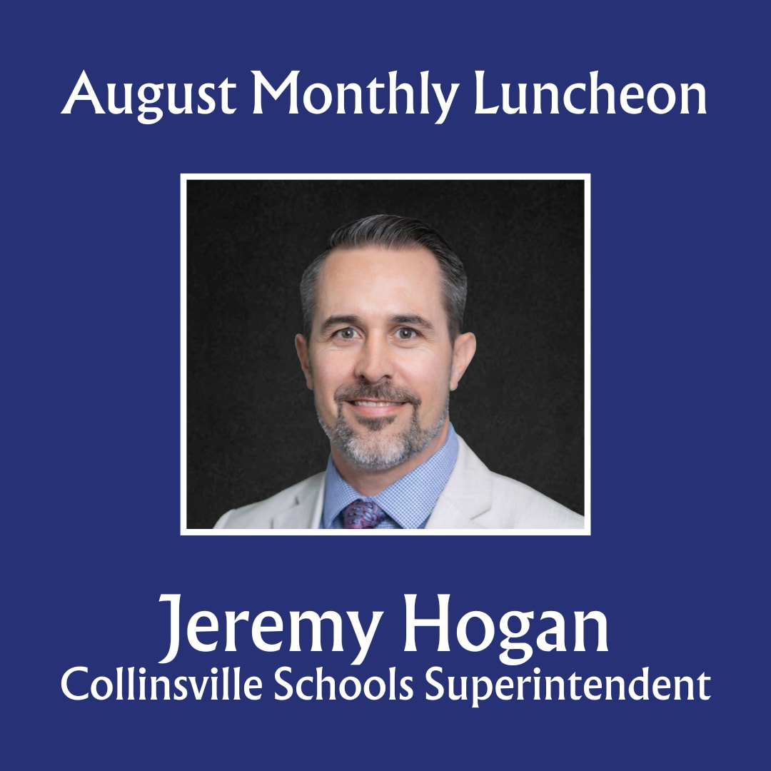We invite you to attend our August Monthly Luncheon. Jeremy Hogan, Collinsville Schools Superintendent, will be our guest speaker. Jeremy will discuss bond issues, projects (current and future), and how Collinsville Schools are navigating the upcoming school year. The registration deadline is Tuesday, August 4th. Don't forget to bring your business card to put into the door prize drawing. We look forward to seeing you there!