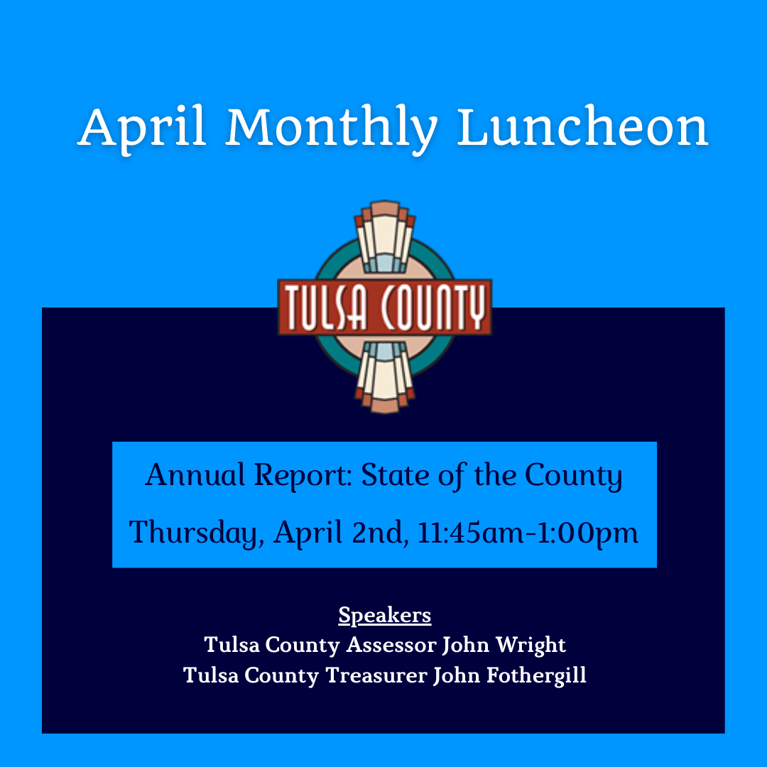 We invite you to attend our April Monthly Luncheon. Tulsa County Leadership will be providing a State of the County. Speakers Tulsa County Assessor John Wright and Tulsa County Treasurer John Fothergill will give updates on news and issues impacting Tulsa County residents, businesses, and communities. The RSVP deadline is Tuesday, March 31st. Don't forget to drop a business card into the drawing for a chance to win a door prize! We look forward to seeing you there!