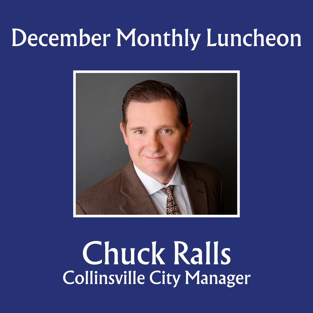 We invite you to attend our December Monthly Luncheon. We’re thrilled to welcome Collinsville’s City Manager, Chuck Ralls, as our guest speaker. Chuck will be providing an important update on what’s been happening in our community and sharing insights into upcoming developments and initiatives in Collinsville. The RSVP deadline is Tuesday, December 1st. Don't forget to drop a business card into the drawing for a chance to win a door prize! We look forward to seeing you there!